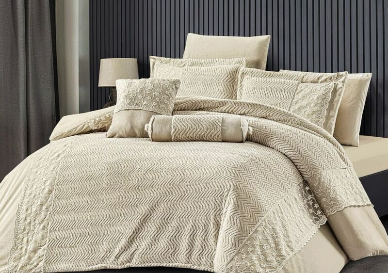 يشمل الطقم مخدات متناسقة مع الغطاء بنفس النمط المنسوج، مما يوفر مظهراً موحداً ومتكاملاً للسرير.